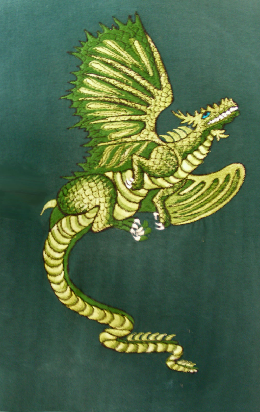We took a picture of our Gorgeous Dragon to our embroiderers in Kathmandu and they produced this beautiful work of Art. The detail is truly breathtaking, it shows the skills of our embroiderers to the full.