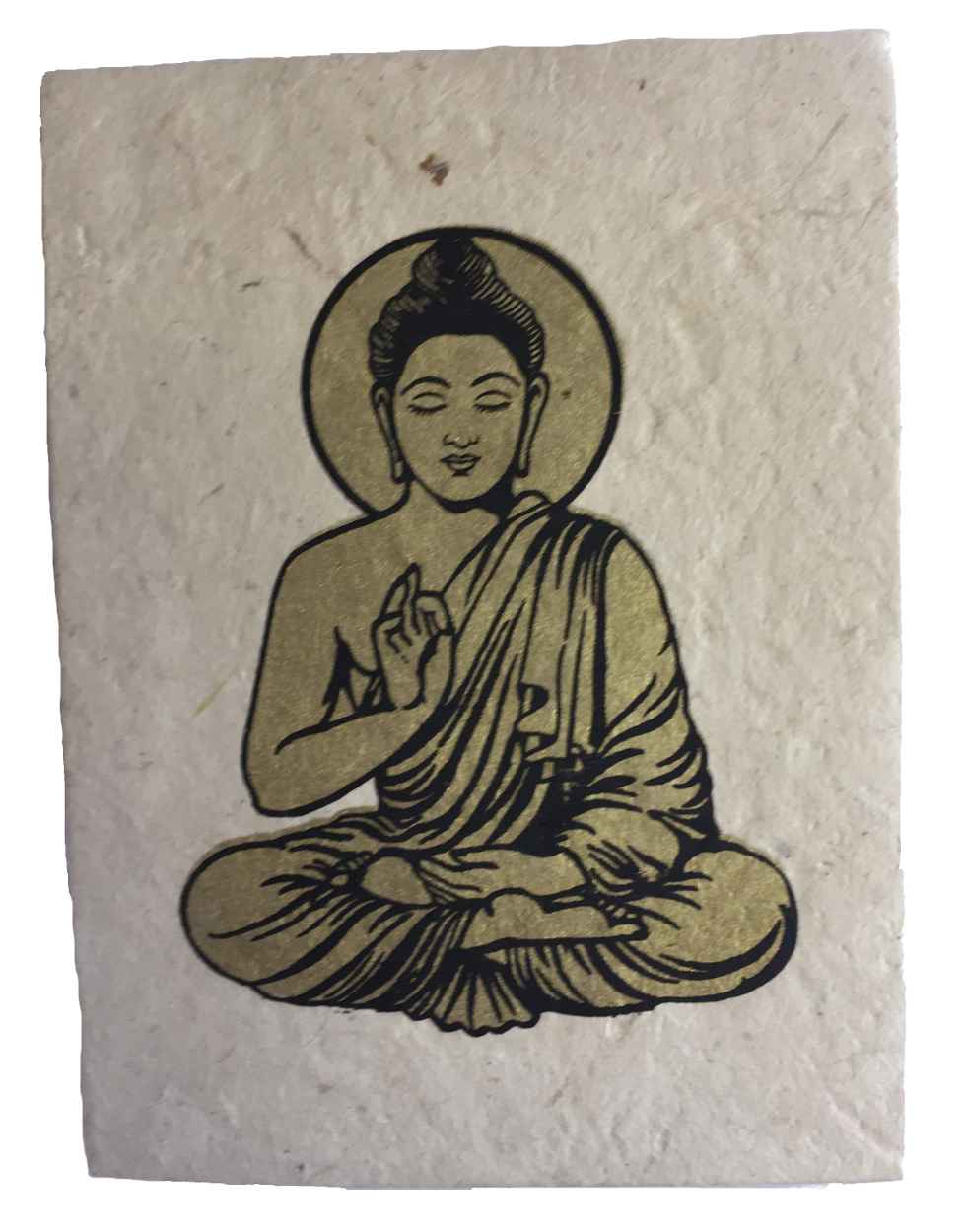 The image of Lord Buddha is screen printed onto our handmade paper notebook using gold paint. The Buddha Image shows the right hand turning the wheel of Dharma, while that of the left hand symbolizes meditation. These two conjoined symbolize teaching the Dharma while in meditation.