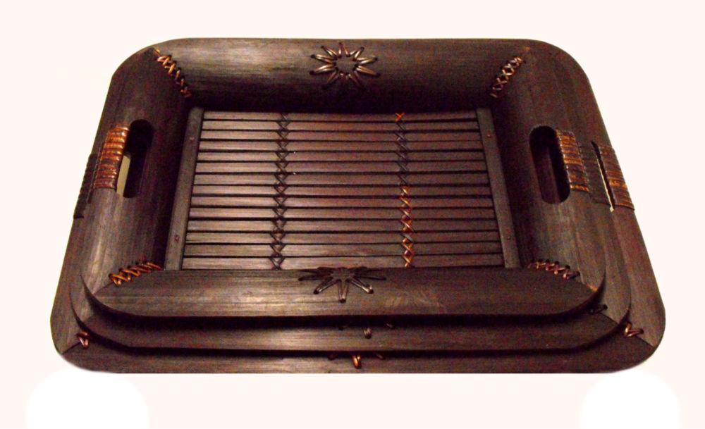 Our Bamboo Tray sets are proving to be very popular. They are strong and lightweight and are perfect occasional trays. They are stained a dark mahogony colour and are decorated with rattan.