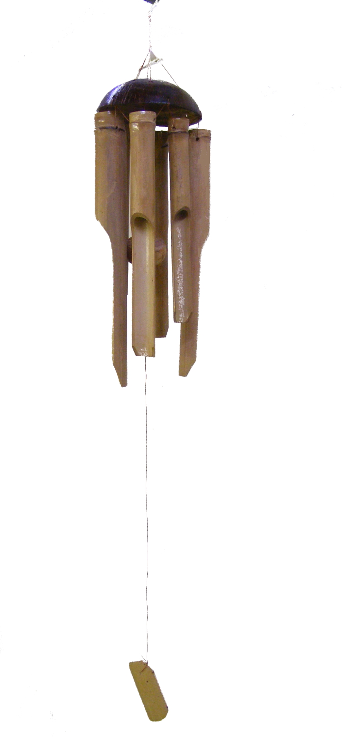 The chimes are hand cut from locally grown bamboo and the crown is made from a locally grown coconut. The coconut and the bamboo are varnished to make them suitable for outdoor use, the string is synthetic so that it does not rot.