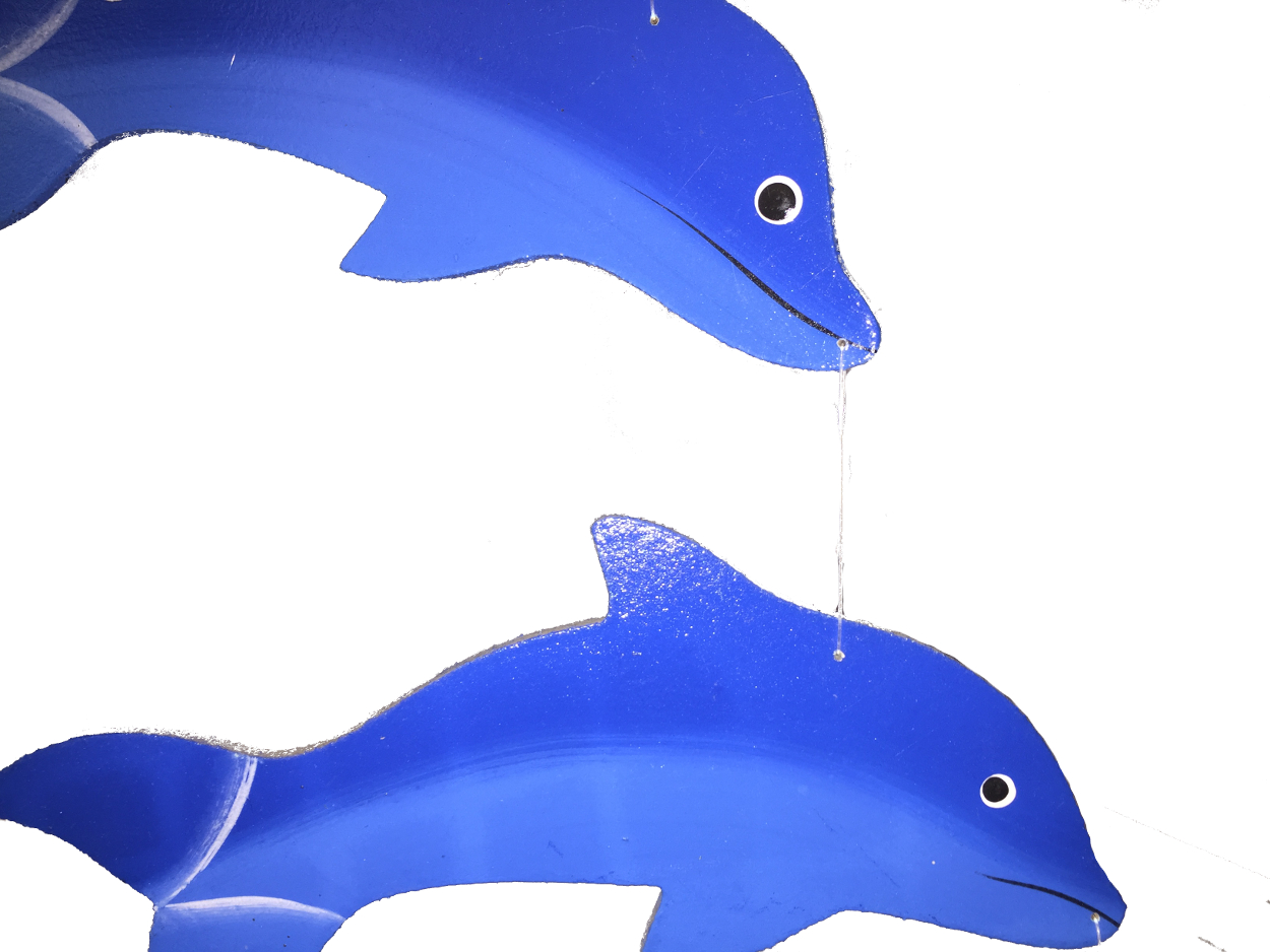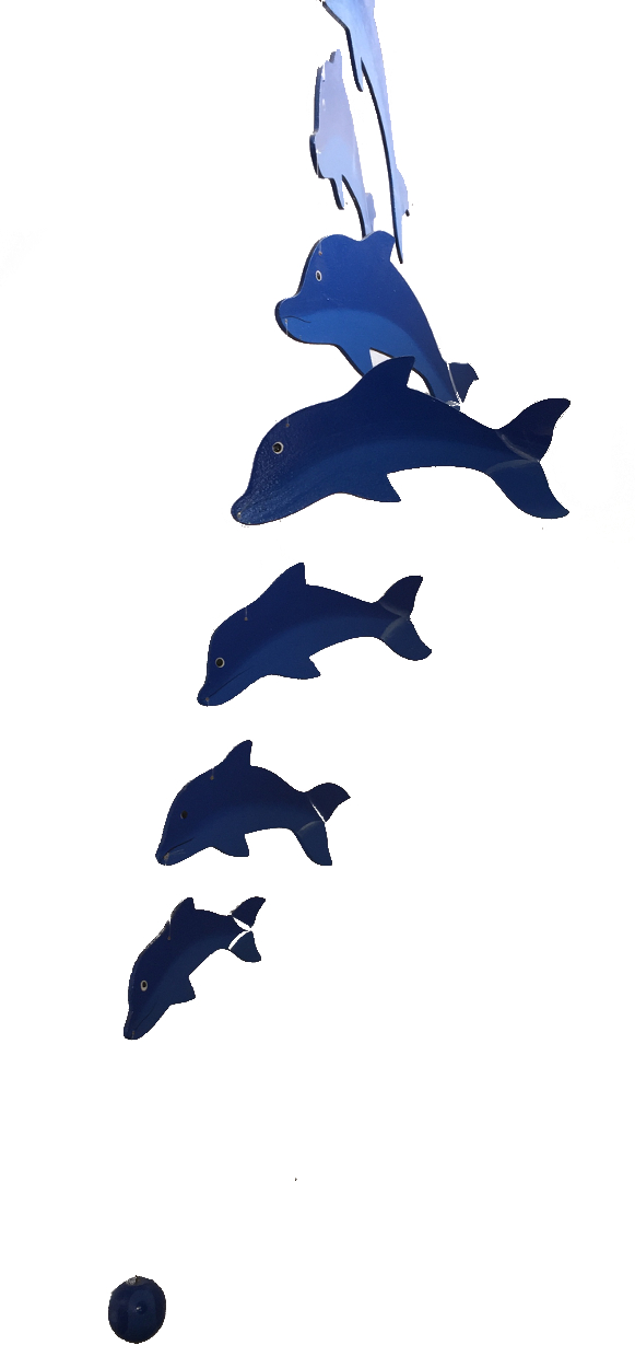 Our School of Dolphins Mobile consists of 7 dolphins that hang one beneath the other and a ball. They swim on currents of air, so if you put them somewhere with a bit of a breeze they are constantly moving around. Otherwise if you fancy a more static display you can hang them against a wall